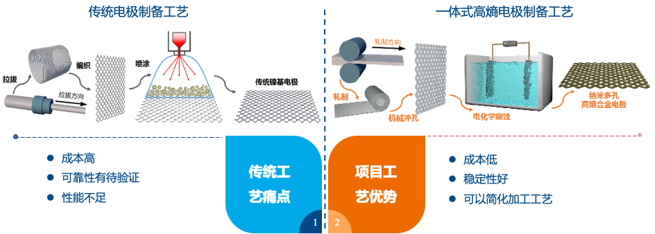 公司聯合南京賽寶工業技術研究院有限公司、天津大學和湖南大學,通過對高熵合金元素協調效應、跨尺度結構設計及電極反應原位觀測裝備等關鍵技術的探索,在材料、結構和裝備方面進行革新,突破現有電極材料活性-穩定性-成本的“不可能三角”,預期最終可獲得一種高效穩定低成本的一體式高熵合金ALK制氫電極。基于對一體式高熵制氫電極關鍵技術的研究,將明顯簡化現有電極的加工工藝,顯著降低電極制備的成本與難度,助力制氫效能和經濟性提升,具有明顯的產業化應用推廣前景。
